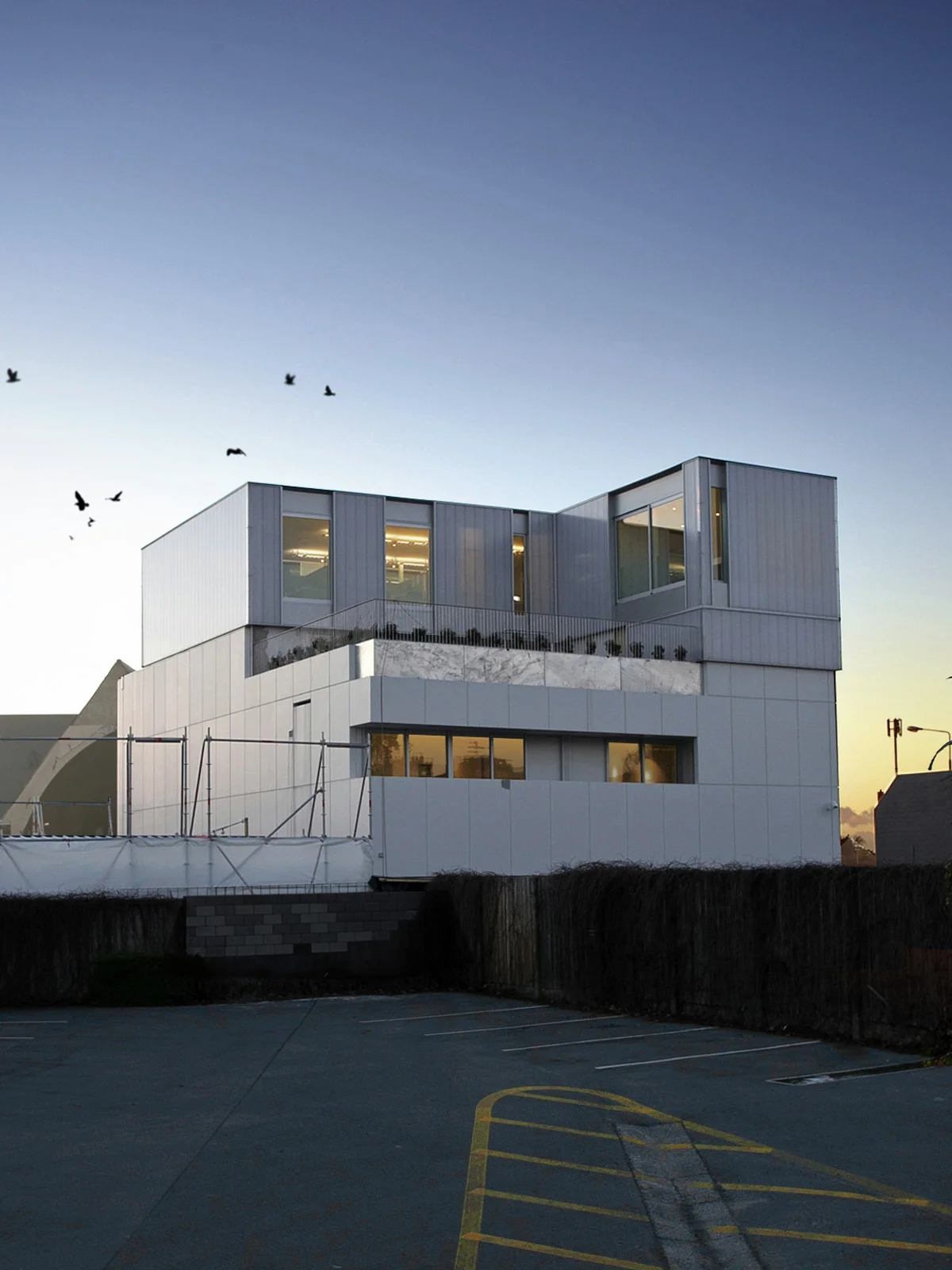 The apartment is skinned with a polycarbonate cladding which, during the day reflects the surrounding elements, while at night is illuminates giving the box an ephemeral glow.